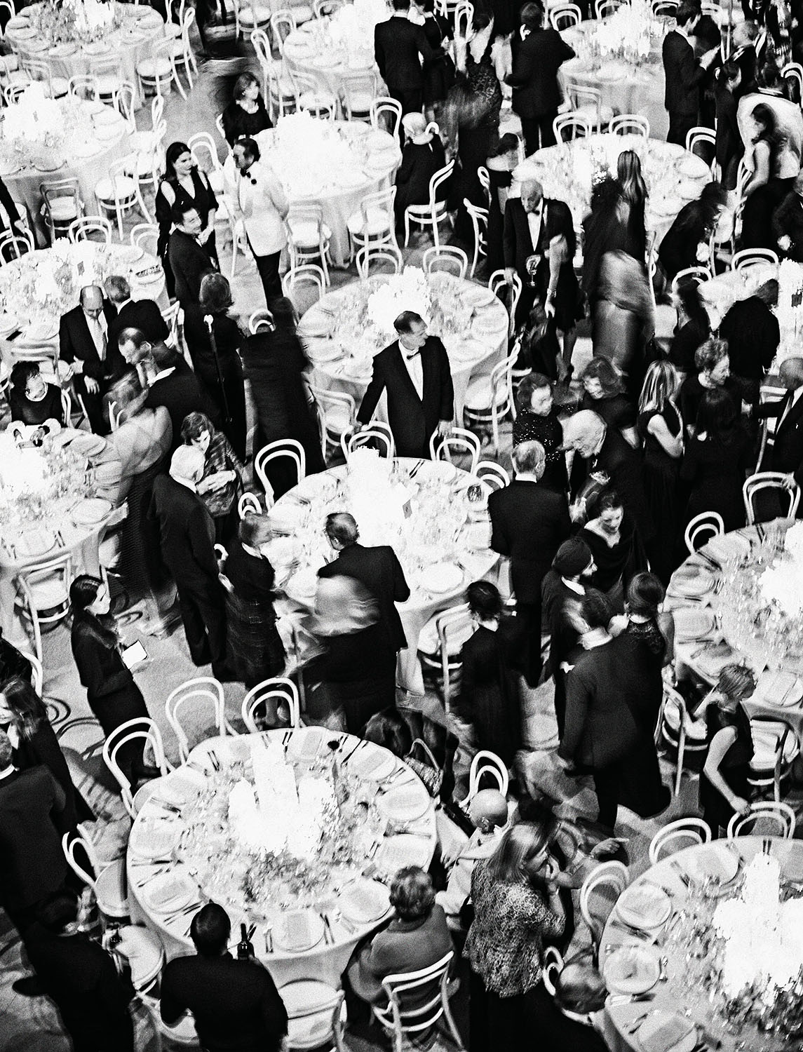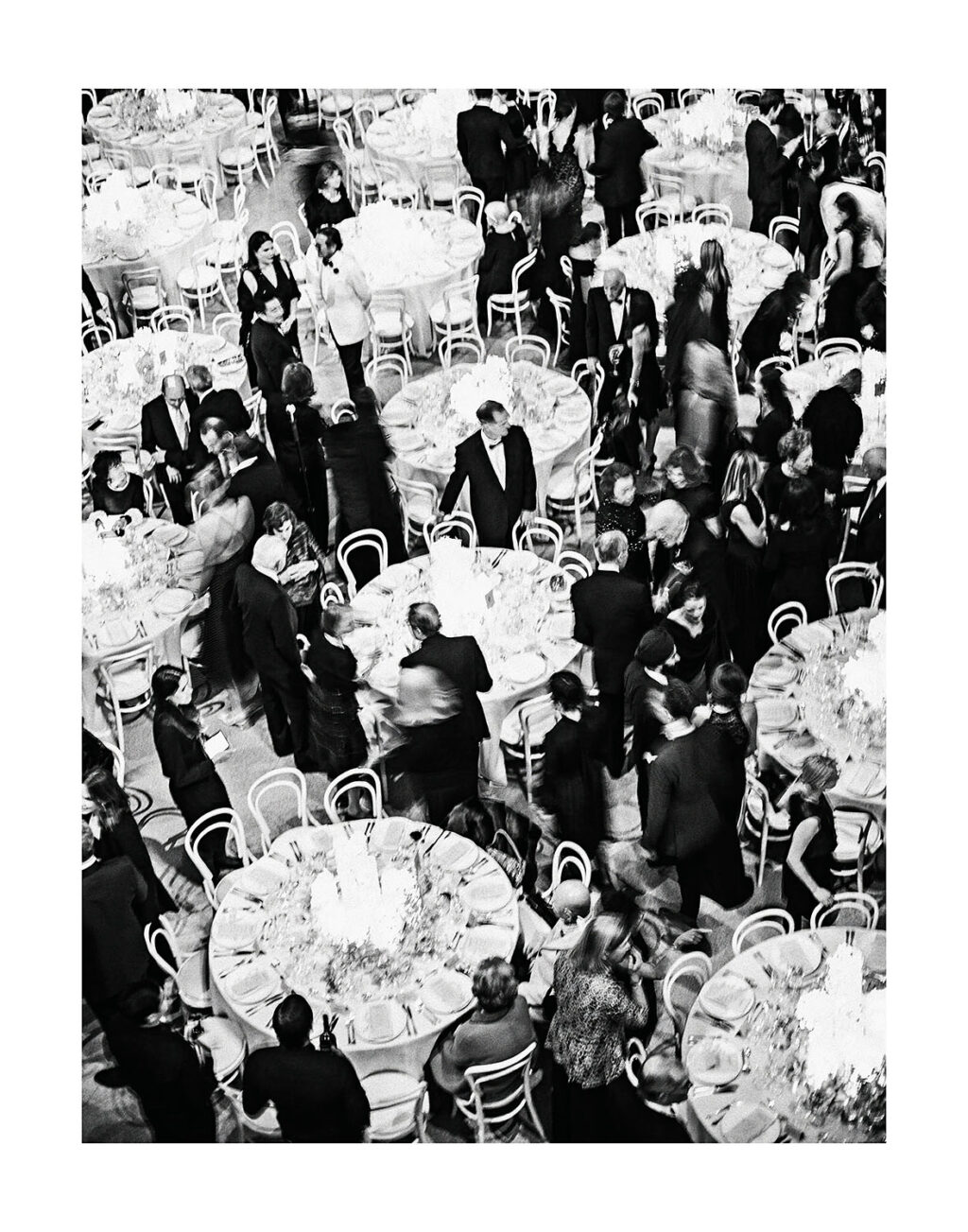 I positioned myself at the top of the museum’s spiraling rotunda, looking down with a long lens into the crowd below. The scene was a swirl of movement—guests dining, talking, drifting in and out of one another’s orbit. In the middle of it all, one man stood completely still, absorbed in something—or someone—beyond the frame.